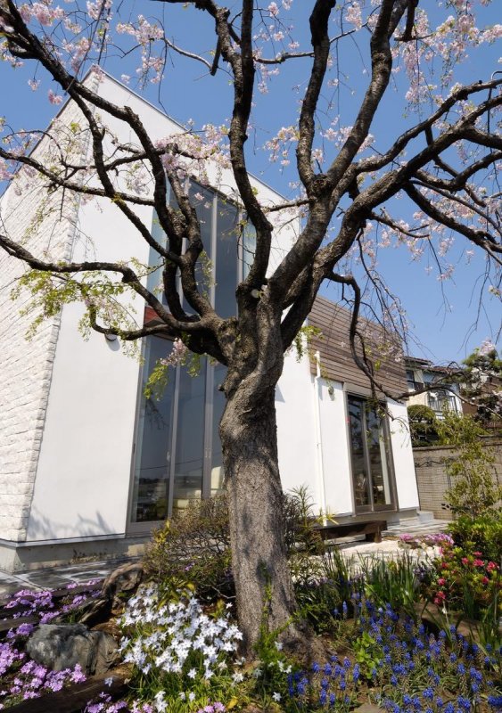 ライフスタイルの違いから、それぞれが独立した個室を持ちますが、吹抜けのあるLDKによって家族の気配が感じられるようにしました。LDKは吹抜けからの太陽光によるダイレクトゲインを受け、ぽかぽかとした日だまりの中から庭の枝垂れ桜を見ることができ、四季のうつろいを室内からも楽しめます。