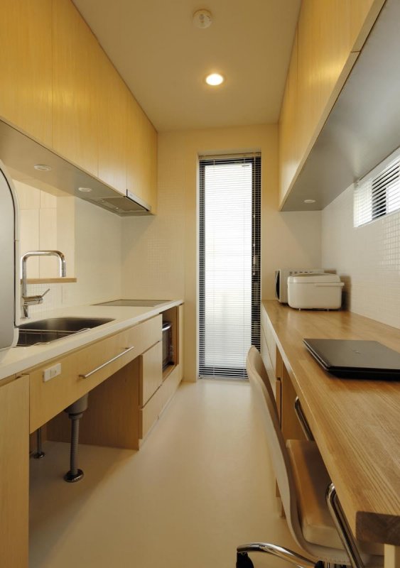 南面、西面を住宅に囲まれた立地条件の中、南隣家の一部だけ2階レベルに抜けがあり、ここに面した吹抜けのハイサイドライトから1階のLDKに光を採り込み、杉の木で作られた障子によってプラバシーを得ながら柔らかく拡散された光を得ます。 この吹抜け部の床仕上げは一段高くレベル差をつけた畳敷きの和室であり、ここが家族のコミニュケーションの中心の場となるように計画されました。建具で仕切れば客間としても使うことも可能で、限られた床面積を有効に利用します。