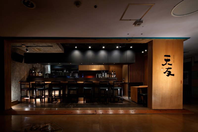 倉敷駅ビルの地下の飲食店街にある8坪の小さなカウンター居酒屋です。奥行3.5M程の狭小テナントの為、必要寸法を図面化していくと、プランの段階で改めてその狭さを実感する事となる。そこで、角地という好条件を生かし、コーナーを切り取る事の出来る全開放引戸のファザードを提案した。これにより、中(店内)と外(共用廊下)を一体化させ、「狭さ」と言う視覚的課題をクリアする事が出来た。レイアウトに関しては、当然こちらも寸法をギリギリまで詰めていく事となる。一人でカウンターに立ち包丁を握る店主にとって、作業寸法とサービス寸法のバランスは重要であり、幾度のシュミレーションを重ねてながら寸法は決めらていった。天友は狭さに立ち向かい、克服して創られた小さな居酒屋である。