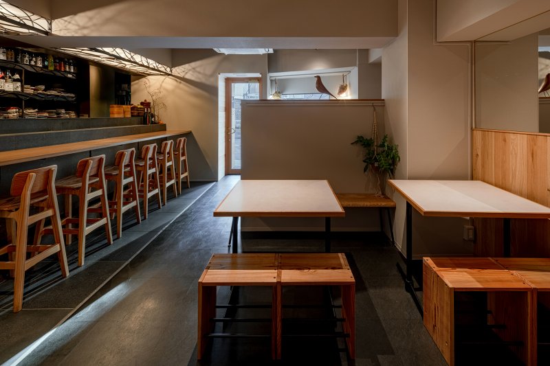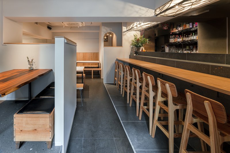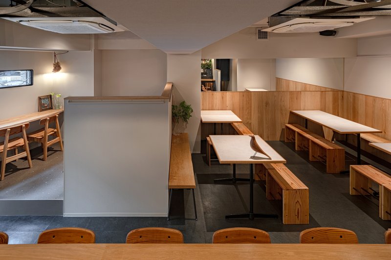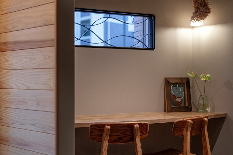 限られた面積を最大限に活かすため、動線と視線の抜けを緻密に計算しました。一人で静かに過ごせるカウンター席、そして仲間と語らうテーブル席。それぞれのエリアを緩やかにゾーニングすることで、他者の気配を感じながらも自分だけの時間に没入できる、絶妙な「おさまり」の良さを追求しています。