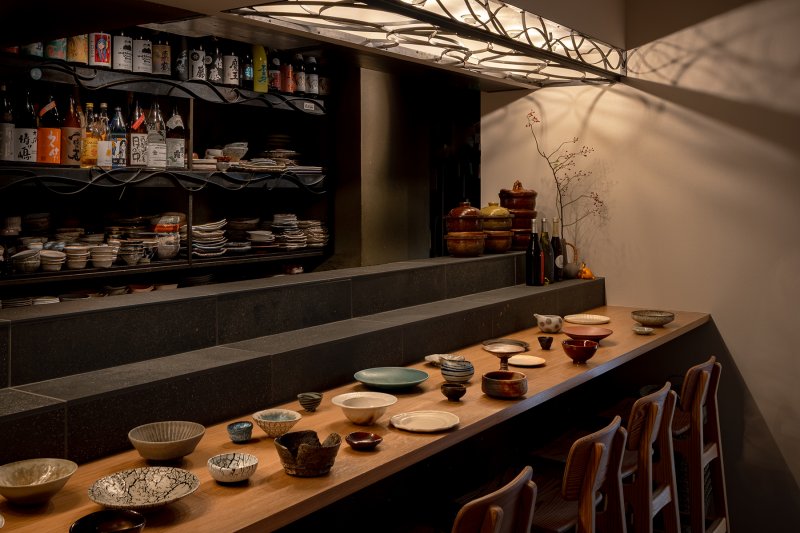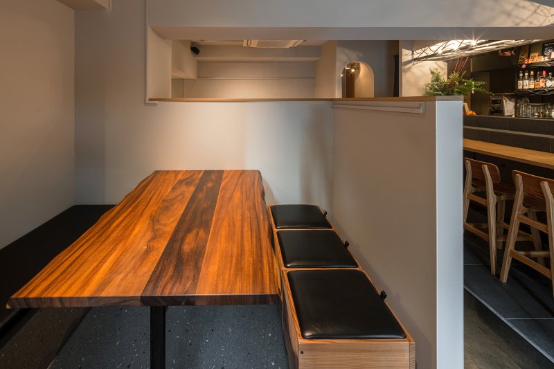 空間構成の核となるのは、木・石・タイルといった、生命力を感じさせる自然素材の調和です。力強い木目が美しい無垢材のテーブルやカウンターは、触れるたびに温もりを伝え、ゲストに深い安らぎを与えます。足元に広がるシックなタイルや石材は、空間に程よい重厚感と品格を添え、異素材が共鳴し合うことで、小規模ながらも奥行きのある豊かな風景を編み出しています。