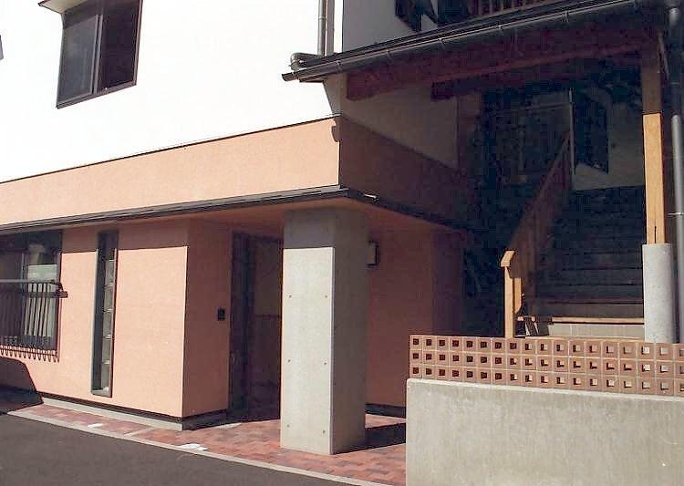 メイン商店街の裏通りに位置する、前面には美しく管理された河川敷がある。川沿いに細長い敷地は変形、道路とのレベル差が2.7mで、高い位置はオーナーの店舗、同時建設した工場+倉庫(2FS造)が密に軒が連なり頻繁に使用される。各室は狭小な敷地の従順な配置により決定されながらも、主要室は唯一窓辺より川を望める。1階はRC構造で別玄関を備えたゲストルームと車庫、機械室よりなる。そしてRCの躯体は擁壁を兼ねて湧水に特殊防水処置を行い内部の湿気・結露対策に十分考慮したものである。上階は木造2階建で、世代間のライフスタイルの変化に対応した造りである。階段は2つ用意されている。内部階段は全ての階に通じ、外部階段はRC下地の身体に優しい木製で造り、川方向に開放している。又工場方向からの緊急避難時のアクセスにも対応できる。断熱は全て外断熱でRC構造を意識したものとなっている。