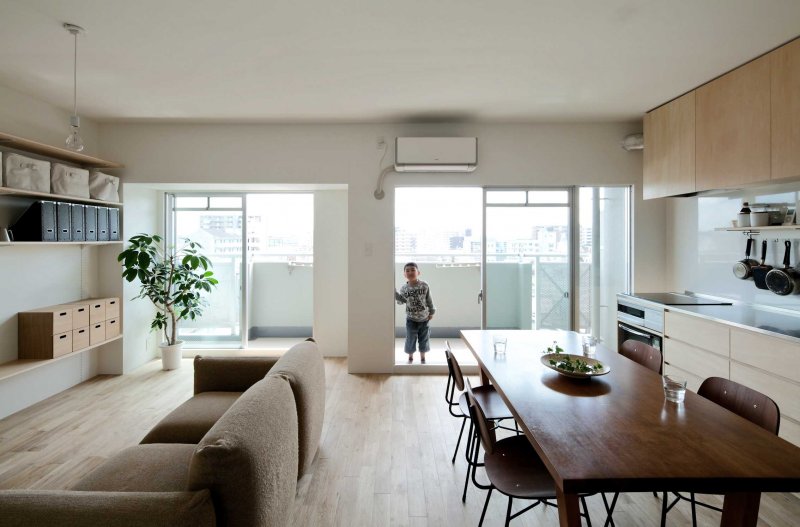 [ 作品解説 ]若いご家族のためのマンションリノベーション。限られた予算とスペースの中で充分な生活空間を確保するため、天井や不要な間仕切りを取り払って大きなLDKをつくり、必要最小限のキッチンと多目的な可動棚のみを合板で製作しました。肌触りの良い無垢フローリングの上で半椅子座・半床座の気取らない生活を送ることができます。