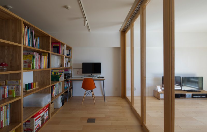 [ 作品解説 ]大阪市中心部。南北両面に大きな窓のある高層マンションのリノベーション。LDKと寝室、将来は子供部屋となる書斎・プレイルームを直列に並べ、南から北へと空気の通りみちを確保することで、窓を開ければ爽やかな風が家の中を通り抜けます。都心のマンションでも、敷地条件を生かすことで自然の機微を感じる住まいになりました。