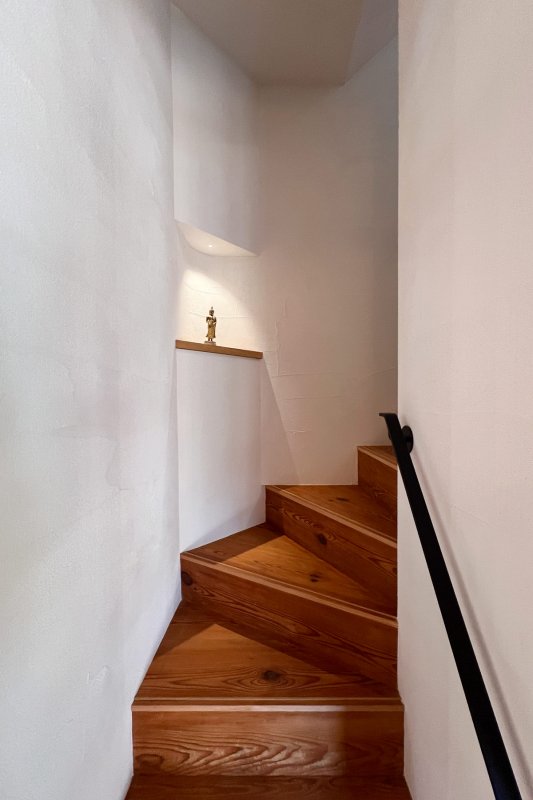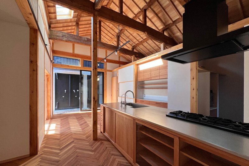 天王寺駅の南に広がる阿倍野。明治から戦前にかけて、天下茶屋駅の東斜面には池の周りに料亭や茶室を拝した風光明媚な公園がありましたが、今では往時の面影はほとんどなく、小高い丘の起伏に沿ってマンションや大小様々な住宅がひしめき合っています。そんな路地の奥に奇跡的に残されていた大きなお庭と邸宅をあるご家族が引継ぎ、次の世代へと命をつないでいく僥倖に恵まれました。建物は幾つかの棟からなり、複雑な入母屋架構や大断面の太鼓梁、無垢の分厚い床板など、貴重な材料で丁寧につくられた形跡が多く残っていましたが、何度か大規模なリフォームが施されて母屋と蔵が棟続きとなり、更に応接間や離れが増床されて問題の多い状態になっていました。計画にあたっては和室の設えや古い無垢材・架構の持つ力強さ・大らかさと、現代的な生活や性能とが歪み合うことなく共存共鳴できるような在り方を心がけ、母屋の中央付近に天井が高いLDK、それを挟むように玄関・水回りを配置しながら内部・外部にいくつかの回遊性を仕掛け、スムーズな動線計画としました。式台や床板は慎重に取り外し、鉋掛けして階段や造作材に転用。障子や框戸も多くは補修し、配置を組み替えて再利用。つぎはぎリフォームで辻褄が合わなくなっていた増築部分や離れを撤去して、防水・構造耐力・採光を無理のない状態へと整理しました。