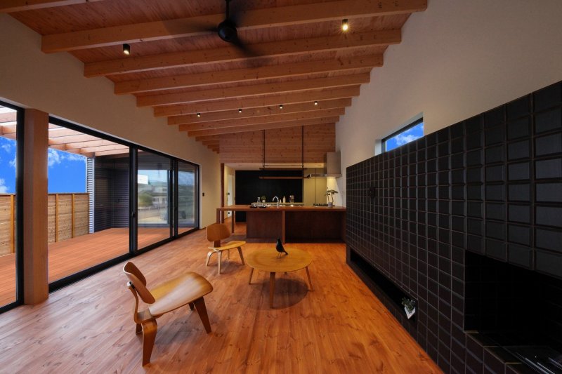 化粧垂木を施した傾斜天井のLDKに、エタノール暖房、壁掛けTVを設ける造作のアクセントタイル壁を配置。