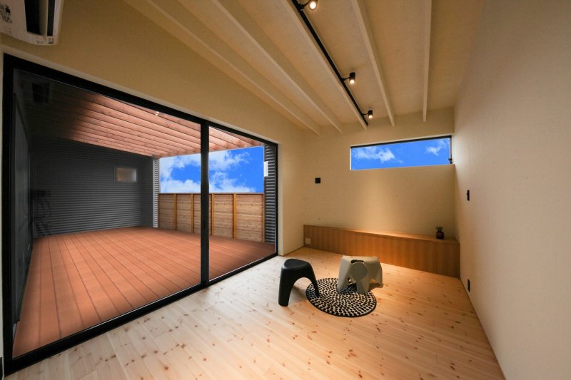 子供部屋はウッドデッキを敷き詰めた中庭と繋がる位置へレイアウト。