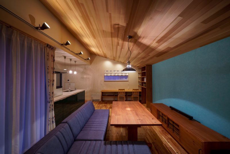 リビングから畳コーナーまでダイナミックに続くレッドシダー張りの勾配天井が印象的なS邸。