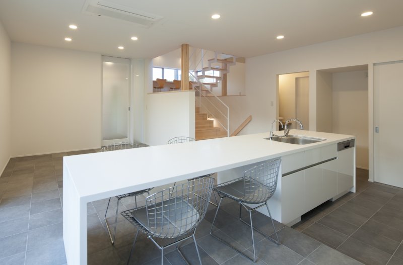 一階は将来的に料理教室を開くことを考え、広い庭と一体化した4.2mのダイニングキッチンを配置して大勢の来客がキッチンを囲むことができるように計画しています。