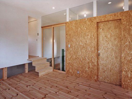 大阪府八尾市に建つスクーターガレージハウスは建築主のライフスタイルを前面に押し出した住まいです。1階に玄関兼用のスクーター専用ガレージと、さらにそれらと一体的にLDKを配しています。また吹抜けを通してLDKと子供部屋が一体化し家族が互いの存在感を感じる住まいとなっています。