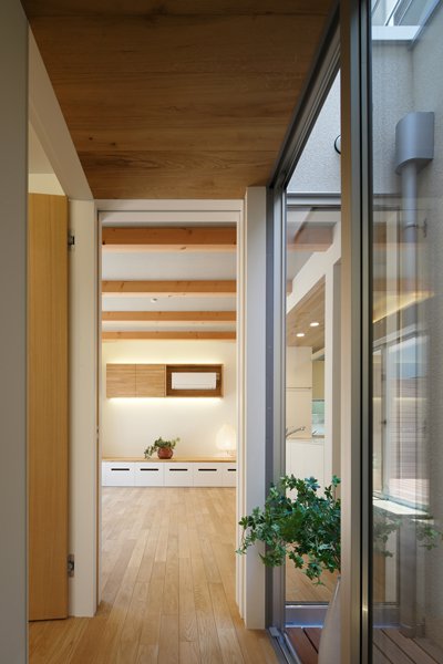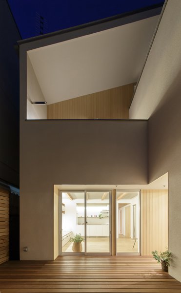 1階に親世帯、2階に子世帯が、それぞれ中央の坪庭を取り囲むように配置されています。 1階の親世帯では、玄関に入ると、坪庭からの自然光に向かい入れられ、リビング・ダイニングに至ります。 リビング・ダイニングは南側に広いテラスを備え、十分な明るさや通風を確保するとともに 実際の面積以上の広がりが感じられます。 2階子世帯のリビング・ダイニングも、南側バルコニーと東側の坪庭に接し、住宅の中央部においても 十分な自然光を導き入れ、風が通り抜けます。 天井は、屋根の勾配なりの断面形状となっていて、東側のハイサイドライトからも光が入り、 空を眺めることができます。 両世帯とも、この坪庭を取り囲むことで、それぞれの家族が、それぞれのプライバシーを守りながら 相互に気配を感じあえるような、絶妙な距離感を保つことができます。 さらには、親世帯と子世帯とが、完全分離でありながらも、付かず離れずの調度良い関係性を保つことができます。