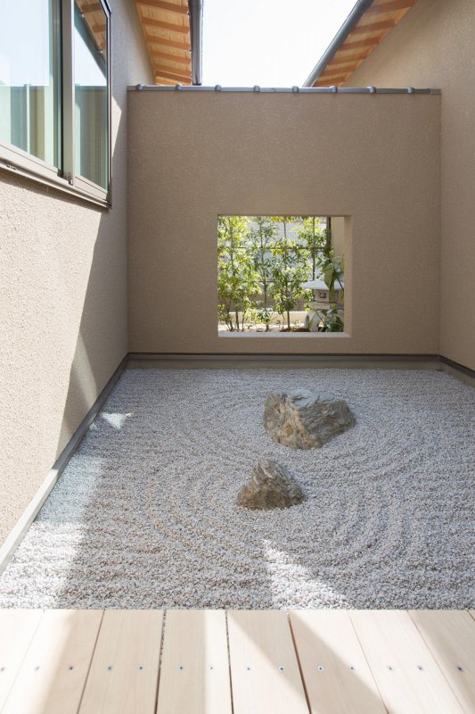 限られた敷地に奥行きと広がりを持たせるため、玄関に前庭、LDKに中庭、中庭の奥に後庭と異なる形式の3つの坪庭を設けて、視覚のストーリー性を演出しています。
