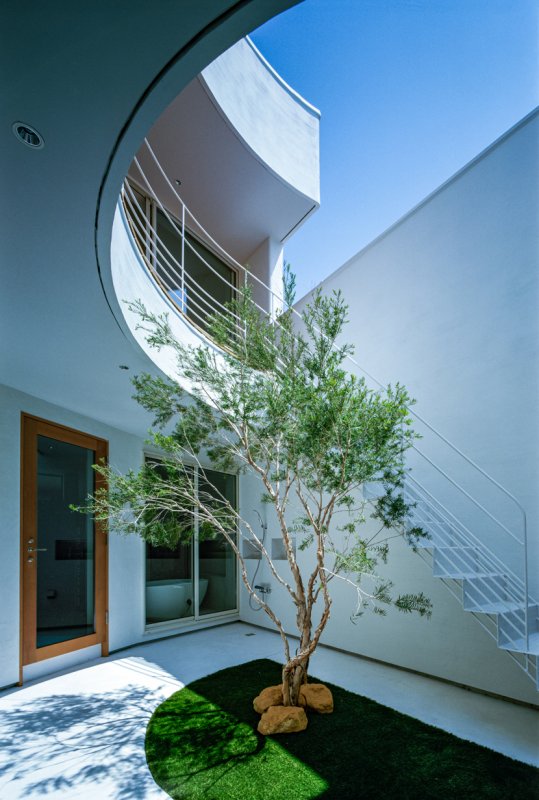 中庭を中心とした、内外、そして上下階に立体的な繋がりを持つ家となっています。