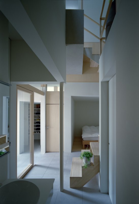 今回のデザインでは、4つのボリュームが2階まで伸びる吹き抜けを設けることで、開放感と奥行きのある空間を創出しました。それぞれのボリュームは適切な距離を保ちつつ配置されており、脱衣スペースなどの機能を持つ「路地」のような隙間が生まれます。これにより、横方向への視線の抜けも意識し、心地よい広がりを感じられるようにしました。