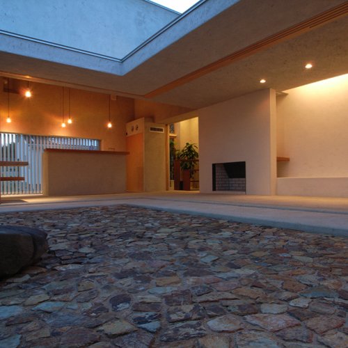 全体のスペースを取りまとめているのが中庭であり、平屋建ての贅沢な空間にはゆっくりとした時が流れるのを感じれます。また白い壁には暖炉を埋め込み、ほのかな炎のゆらぎも感じることが出来ます。