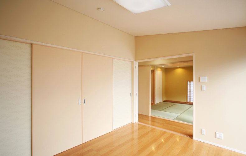 三世帯が一緒に住まいされるKさんの住宅は、町屋風の奥に長い敷地形状を活かし、南・平屋部分はご両親の寝室と和室、中央部の広いリビング、そして 北・2階建て部分を夫婦と子供さんの寝室群とで構成しています。