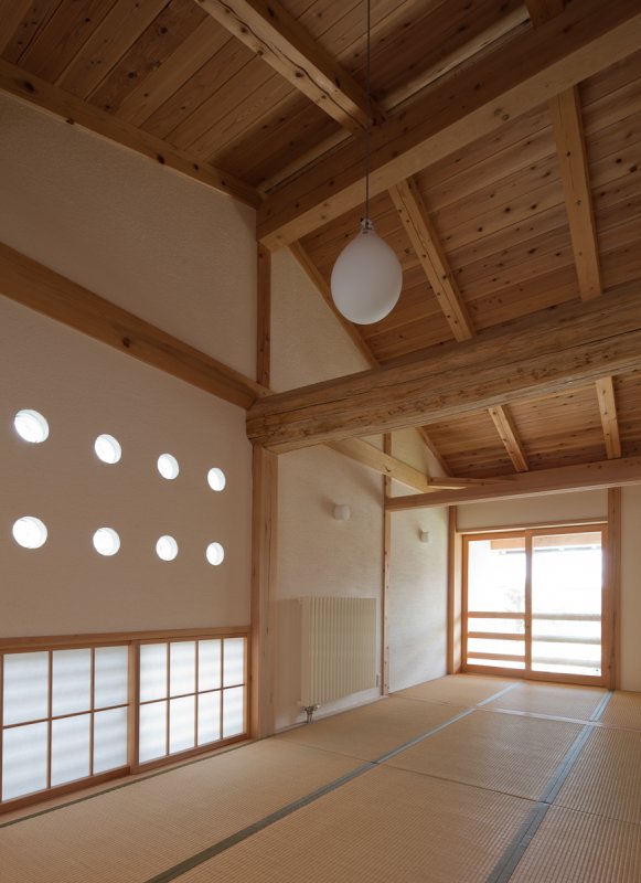 居間吹き抜け南の大きな開口部と、深い軒により自然(太陽の恵み)
