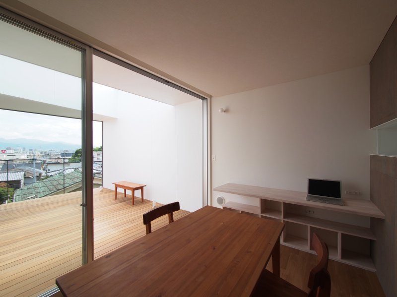 リビングダイニングを2階に計画することで、眺望を確保しました。大きなバルコニーを挟むことで外部との一体感、外部からのプライバシーを守りながら開放性を得ることができました。1階には通り土間と廊下を兼ねたスペースを確保しています。この通り土間は、住空間の中心を通ることで各々のスペースと繋がったターミナルとしての起点の場となります。もちろんガレージの愛車を見ることもでき、将来に和室で着付け教室を開く時のもてなしのスペースにもなります。