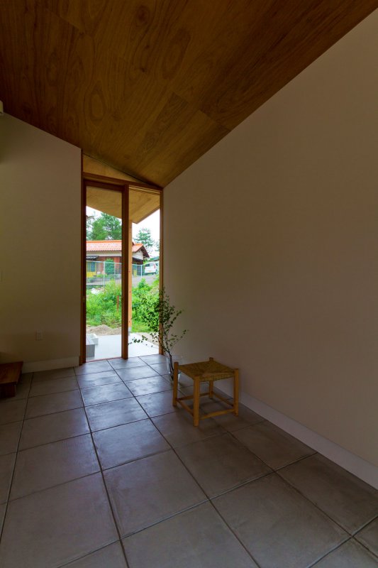 大きな土間は親戚の家へとつながる裏口へと続き、家族と家族をつないでいます。大きな開口は土間と大きな景色の間を遮ることなく繋ぎ、また中で過ごしている人と外で過ごしている人とを繋ぎます。