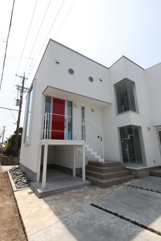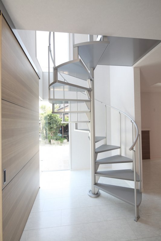 「狭くてもオシャレな家にしたい。」と、クライアント。決して狭い敷地ではないのですが、そこには、ご自身の仕事場を併設した建て物が必要。 それで圧迫される居住部分はスキップフロア等を駆使して、スペースや空間を確保し、 中央にモニュメントな螺旋階段を配置し、その両側に住居棟と事務所棟をウィング状に開く形状でつなぐデザインとしました。