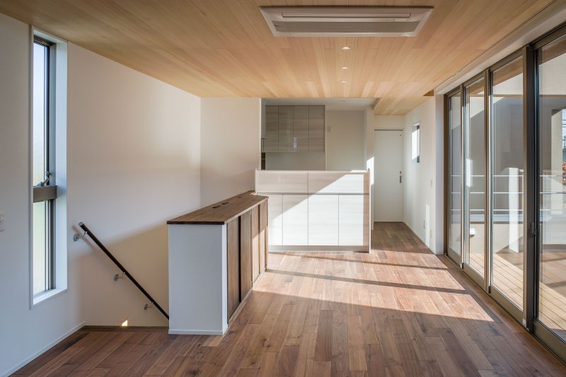 玄関ホールから2階へ上がる階段の脇にはコート掛け収納があり、自分たちのほかに来客用のコート類も仕舞えるスペースを確保しています。階段を上ると、リビング・ダイニング・キッチンと間仕切りの無い広いワンルームになっています。
