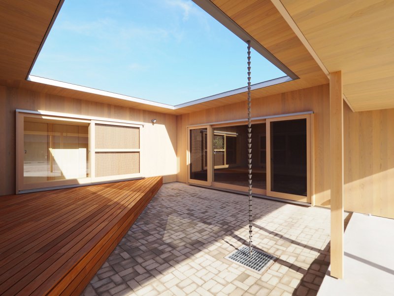 中庭は前面道路から地続きにつながり、外壁のラインにある柱、屋根のかかった軒下空間、そこに落ちる影、中庭に敷設したセメントレンガなど、それらが曖昧に領域を示し、家族の私的な空間を緩やかに確保されるよう計画しています。 また、室内の”コ”の字型のプランに対して45度で斜めに床を貼ることと合わせ、中庭に三角形のデッキをつくることで、家族の私的空間である、室内と中庭の一体感を協調されるようにも考えました。