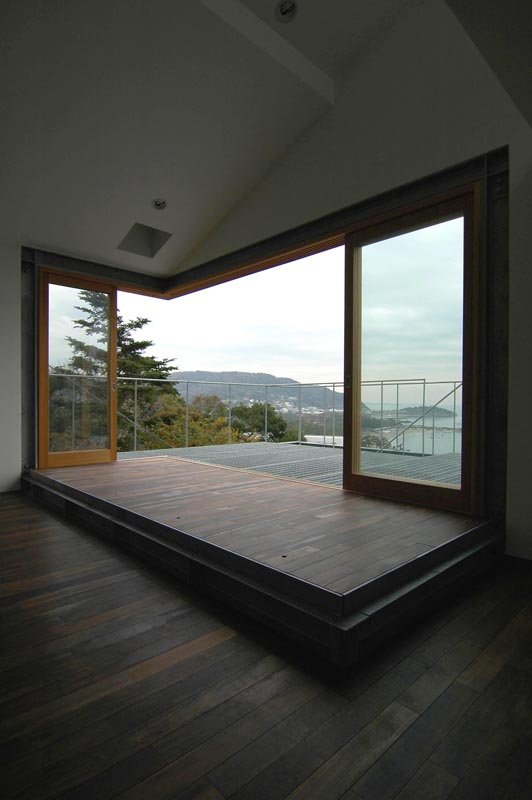 海岸へと連続する鉄骨とグレーチングによる5m×5.5mテラスと267.4φの支柱はフライングバットレスのように建物の構造的な補強として2階のリビングに挿入されている。このテラスは既存のリビングの約1/2の面積にも及ぶ。