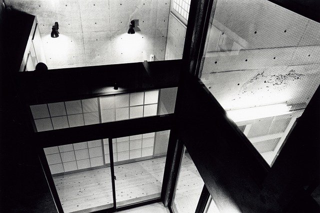 建物は、吹き抜けを持つコートを挟んで2つのコンクリートの箱が建つ形状を持ち、外階段がつなぐ構造となっている。