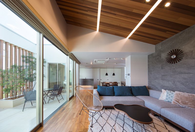 2階リビングの天井は、屋根と同じ勾配でテラスバルコニーに向かって勾配を持たせることで、リビングに開放性を持たせ、広がりのある空間を造り出しました。天井をレッドシダーにする事により外観デザインとの一体感を造り出し、落ち着きのある空間を造り出しました。天井の十文字の間接照明は、キッチンカウンターの間接照明とで、リビングにシンプルでモダンな落ち着きのある空間を造り出しています。