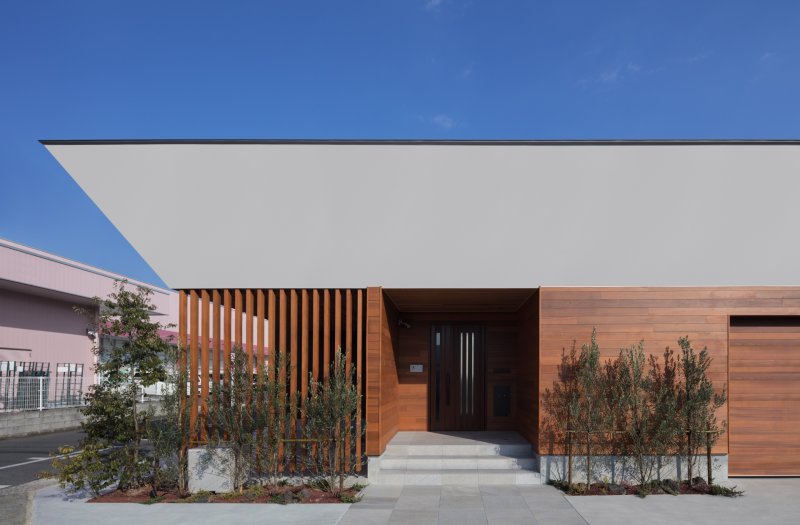 建築の造形的なデザインとしては、石材と木材の組み合わせを量塊(マッス)で表現しています。また、木材にはレッドシダーを用い、シャープで温かみのある外観としています。