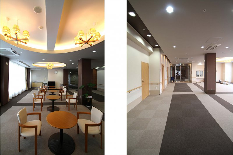 1階はシックなトーンのデザインでラウンジの様な居心地の良さを、2階~4階は木目を基調とした安らげる居住空間とし、自宅にいるのと同じ気持ちでいられる場所にしています。どの階にも、円形の間接照明をつくり、特徴的な木製のペンダントライト照明を下げることでグッと優しさが増す高品質なラウンジ・食堂になっています。老人ホームはどうしても暗くなりがちですが、共用部に光を4方向から入れており非常に明るい生活の場となっています。