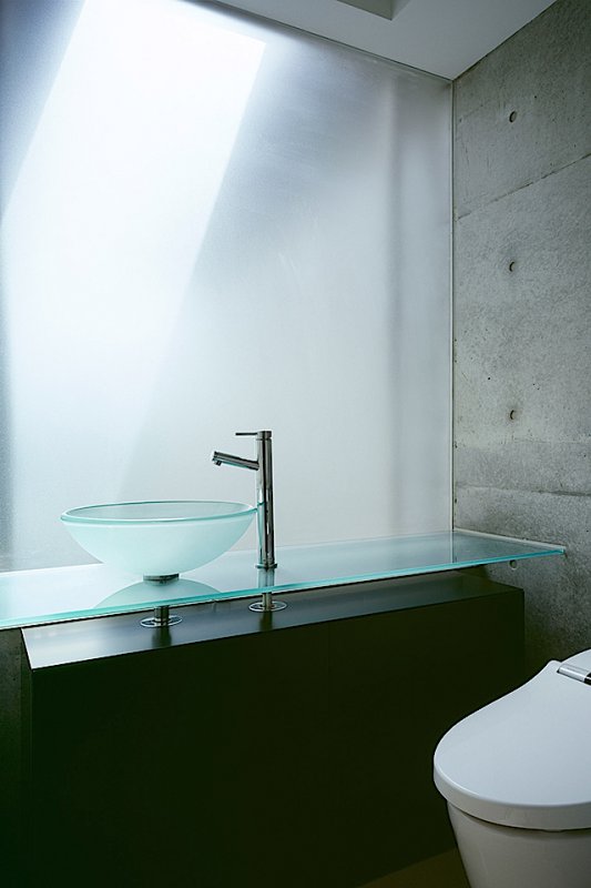 敷地前が大きな河という絶好のロケーションを活かし、河を望む方向は全面開口としたリゾートホテルのような家です。壁/床はスリットにより切り離し、直線的な要素のみで建物を構成することにより、RC打放しにありがちな量塊的な重さを、軽やかな表現へと変換したシンプルモダンデザインです。将来的に2世帯住宅にも柔軟に対応できるように、建物を2棟の構成にし、上部でこの2棟を連結しています。川側を目一杯の窓にするために各棟の入口は川側へ設けず、棟間を離して路地状スペースを作り2棟共通のアプローチ空間になっています。休日は河原を散策する人が多く、2階のバルコニーは景観を楽しみながらくつろぐ空間というよりは、室内への緩衝帯的な意味合いが強い空間なので、視線を気にせずにゆったりと景観を楽しめる屋上庭園を設けています。