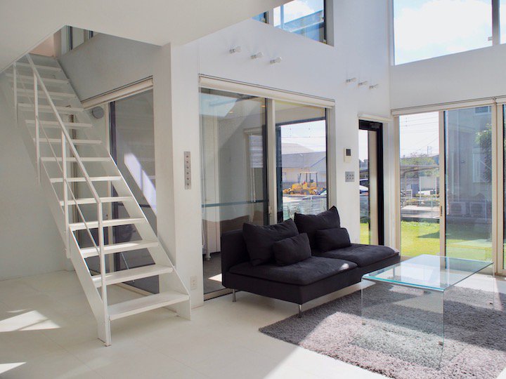 玄関ドアを開けると目の前に現れる空間は建物中央部分に設けた中庭となっており、そこは外部と接続された空間のため、内部であり外部である曖昧な空間となっている。